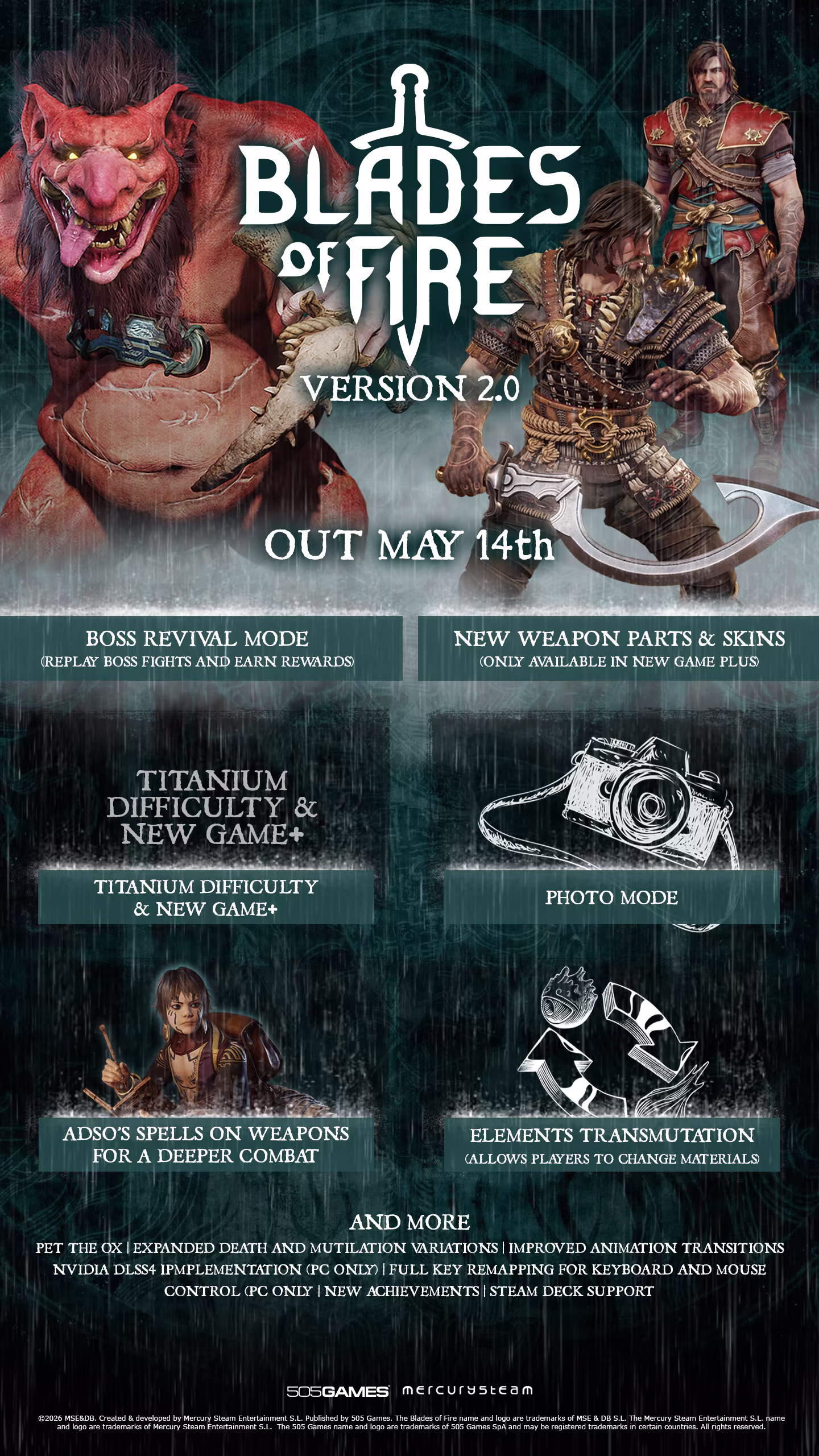 Feitiços do Adso que encantam as armas e proporcionam um combate mais profundo (recompensas vinculadas ao Modo Boss Revival, que introduz feitiços que melhoram as habilidades das armas com efeitos especiais)