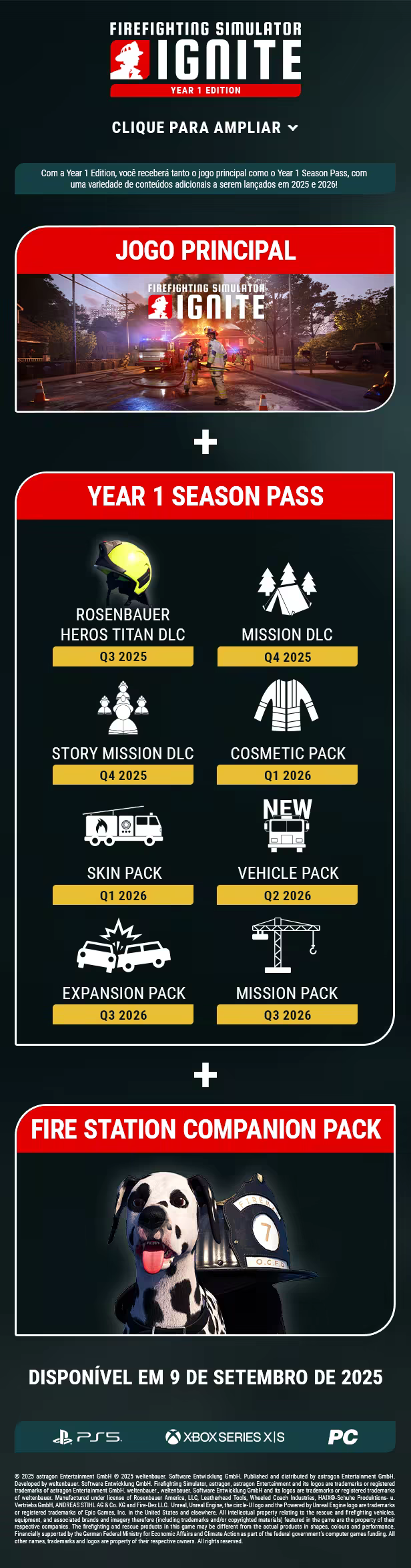 UNIDOS CONTRA O FOGO. Enfrenta perigos imprevisíveis sem hesitar, combate fogos perigosos com a tua equipa e salva vidas no Firefighting Simulator: Ignite. Calça as botas de um bombeiro dos EUA numa grande cidade do Centro-Oeste americano, onde todas as missões vão levar as tuas capacidades ao limite. Descobre as emoções do combate aos incêndios com uma qualidade visual surpreendente num modo multijogador intuitivo e cooperativo com 3 amigos ou com a ajuda dos membros da tua equipa controlados por NPCs. Enfrenta chamas intensas e dinâmicas com calor e fumo simulados em tempo real e com física e sistemas gráficos topo de gama graças ao Unreal Engine 5, e envolve-te no combate a incêndios como nunca antes.